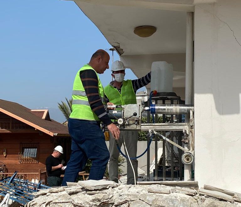 Hatay’da bulunan personellerimiz, binalardan karot testi için numune alıyor.